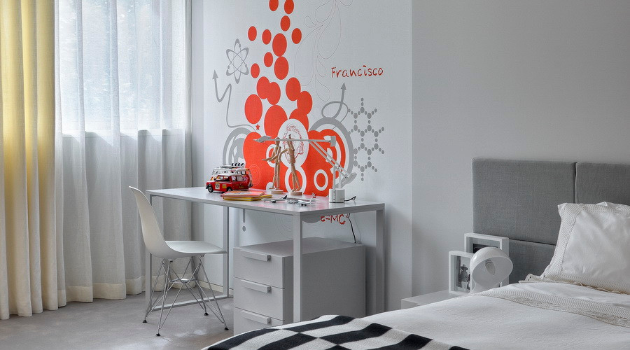 В хозяйской спальне доминируют спокойствие и уют. Первое обеспечивается неярким оттенком зеленого шелка, в который выкрашены стены, а панели за изголовьем кровати обтянуты натуральным льном того же цвета. Уют же обеспечивает шерстяное напольное покрытие, ткани и аксессуары. Отдельного внимания заслуживает ростовое зеркало, как бы небрежно прислоненное к стене. В детской комнате доминирующая светло-серая цветовая гамма в сочетании с льняным текстилем создает нейтральный фон, на основе которого можно легко акцентировать те или иные аспекты меняющихся с возрастом вкусов подрастающего поколения.